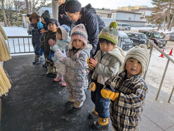 0,1歳児のみんなは凧あげでお正月を体験です。