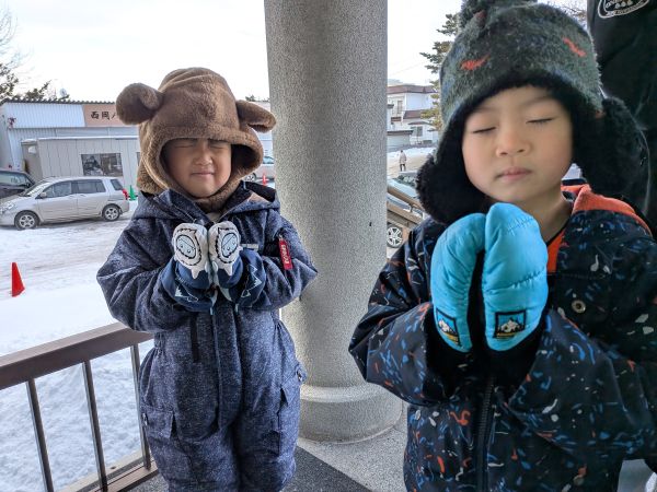 神社に到着すると真剣な表情でお参りです。