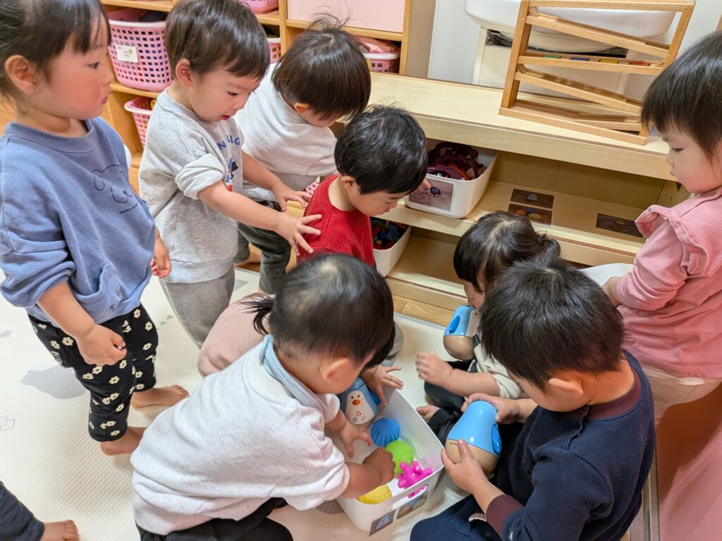 いざ遊ぶ時間となると新しい沢山のおもちゃといつもと違う雰囲気の部屋にみんな少し戸惑いがあったのか、始めは一塊になって遊んでいました!