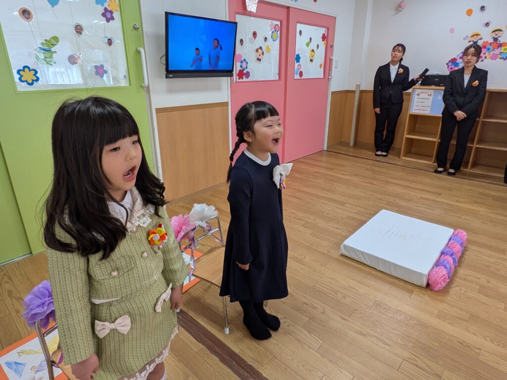 卒園児2名の卒園式を行いました。約2カ月前から卒園児、在園児ともに練習してきました。いざ本番、いつもと違う雰囲気に緊張する子ども達でしたが練習の成果を存分に発揮してくれました💁‍♀️💁‍♀️✨