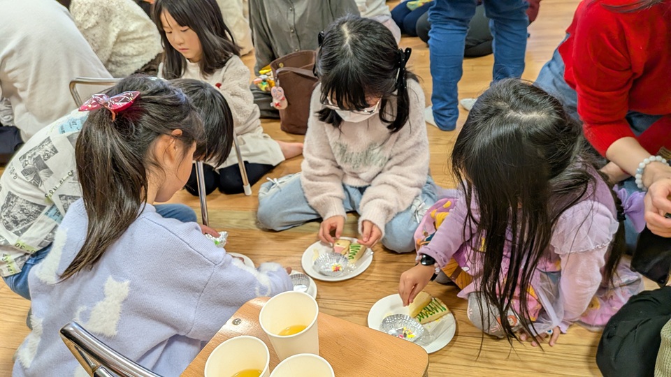 お菓子作りの時間では、なんと!今回はクリスマスツリーケーキとサンタさんケーキの2種類をを作りました!!ケーキの飾り付けが終わるとケーキを前に目を輝かせる子どもたち。完成するのを待ちきれず、サンタさんのおめめを先に食べてしまう子やお友達と見せ合いっこをして楽しんでいる子など様々でココロもおなかも満たされる思い出に残るひと時になりました。