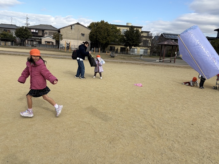 初めは、スタッフの見本を見ながら子どもたちが順番に飛ばしていくと最初は上手く風に乗れず飛ばすことが出来なかった子どもたちも少しずつコツを掴みながら最後は上手に凧を飛ばすことができ、思いっきり凧あげを楽しむことが出来ました!