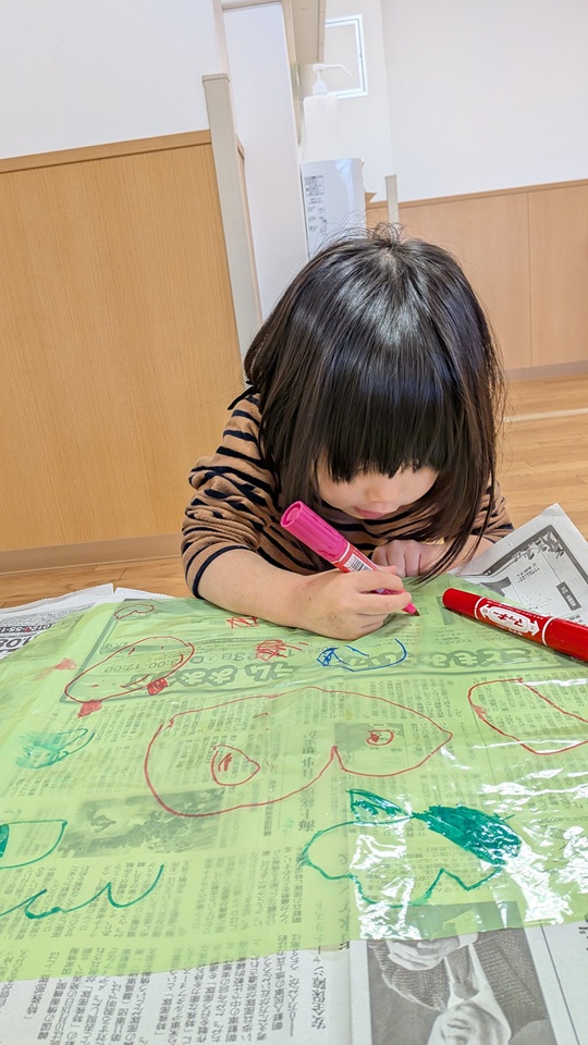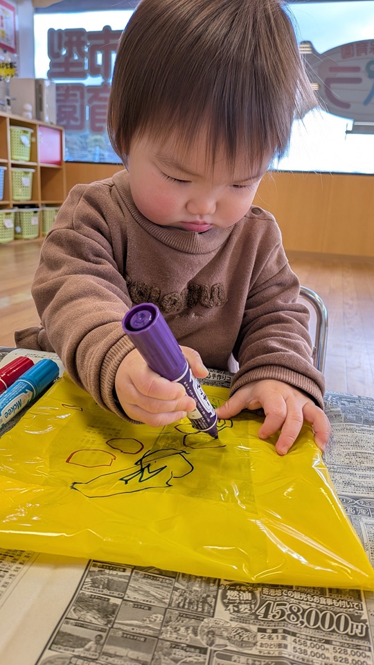 2歳児は、ビニール袋に思い思い絵を描きました♬