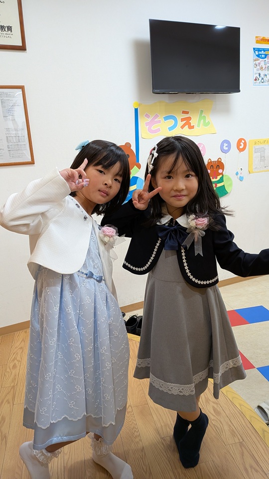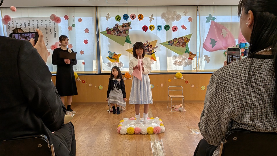 卒園式当日。卒園児二名は堂々とした姿で入場し、少し緊張しながらも笑顔を見せながら式に臨む姿にこれまでの成長を強く感じ職員一同心を打たれました。