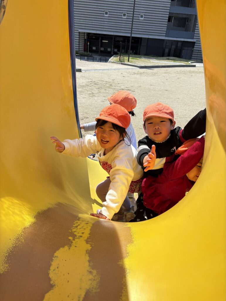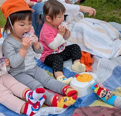 天気に恵まれ、乳児さんはおにぎり。幼児さんはお弁当を持って少しいつもと違う特別感があり、子どもたちはウキウキで笑顔が溢れていました。