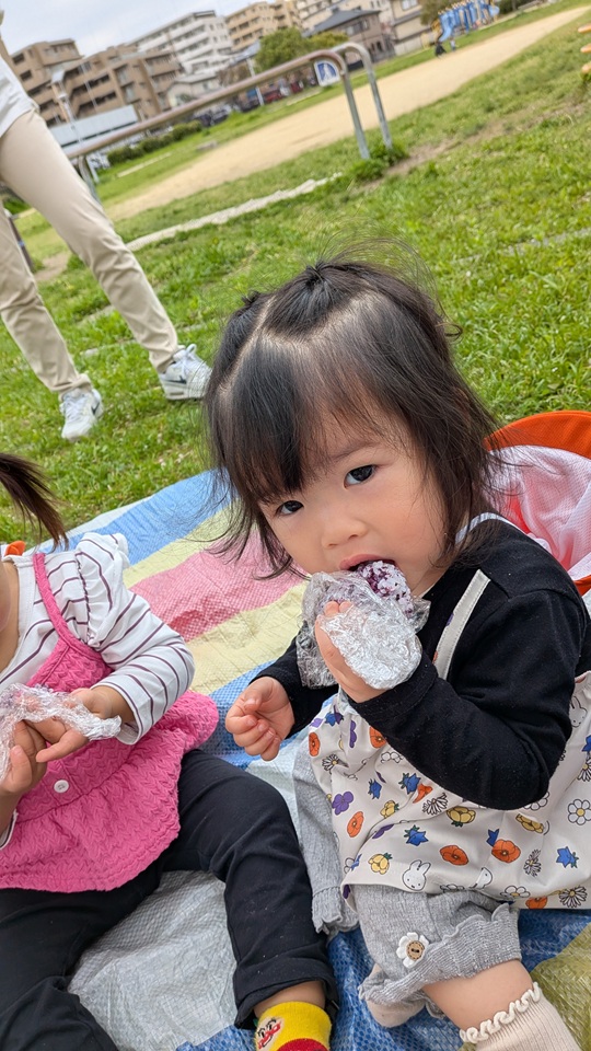遊具で体を動かした後、桜の木の下でお弁当を食べました。自分たちで握ったおにぎりは、特別な味だったようでいつもより食べるスピードが速かったです🍙