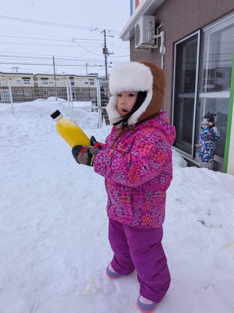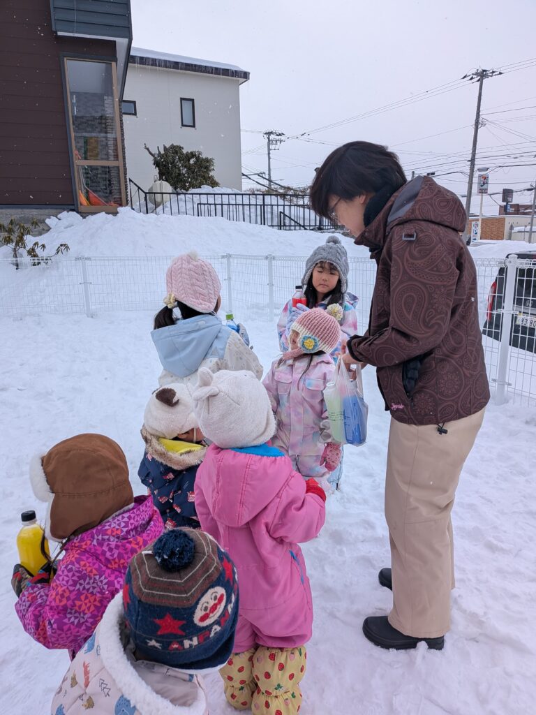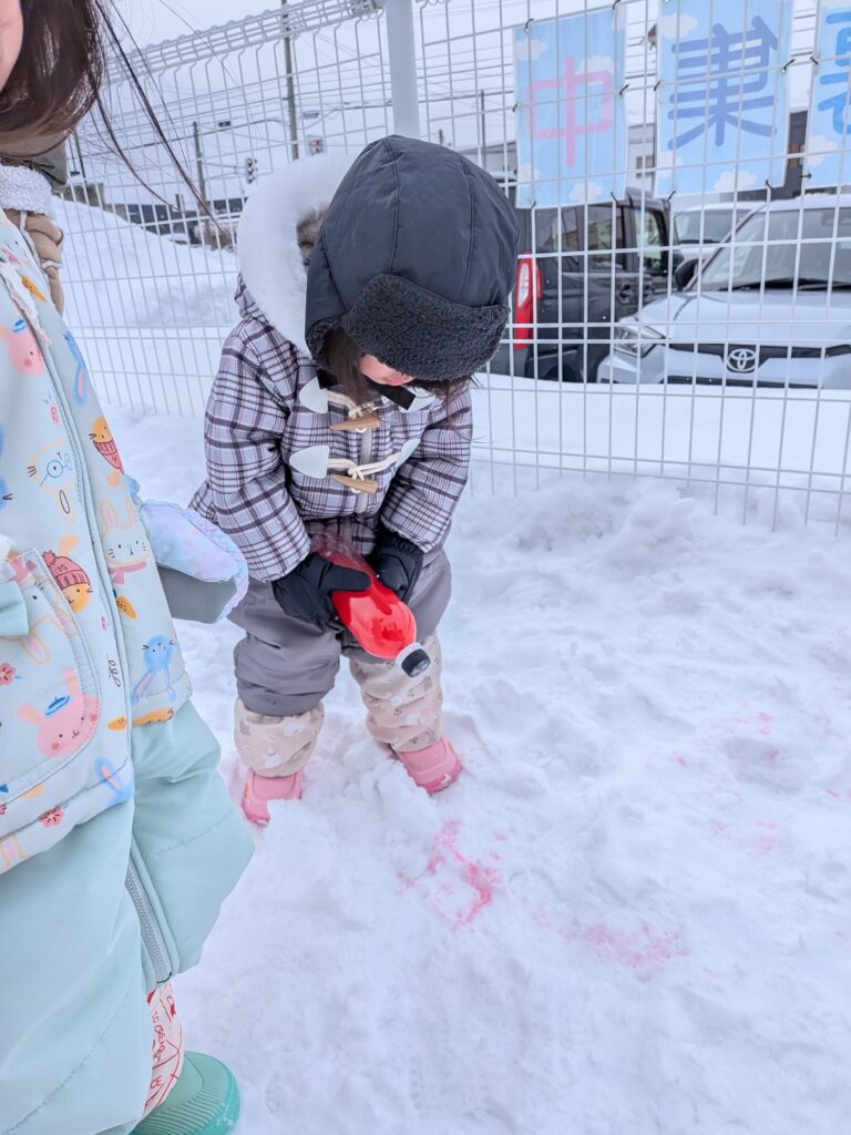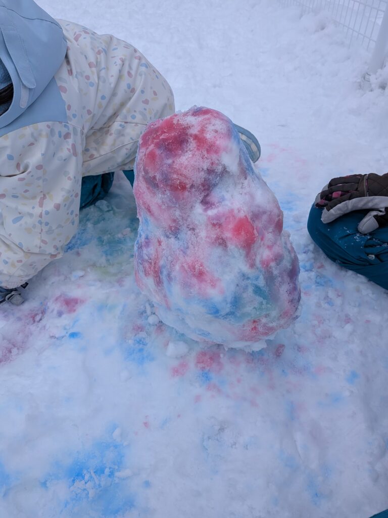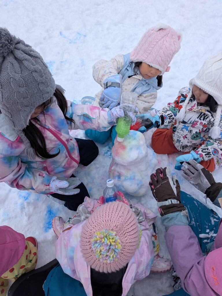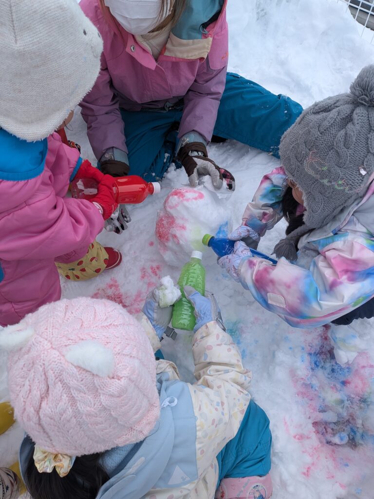 色とりどりの色水を使って、きれいな色の雪玉を作ったり、雪の上に色水で絵を描いたり。