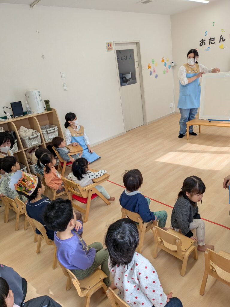 次は、お楽しみの先生の出し物、「まいごのまいごのこねこちゃん🎵」のペープサートです!