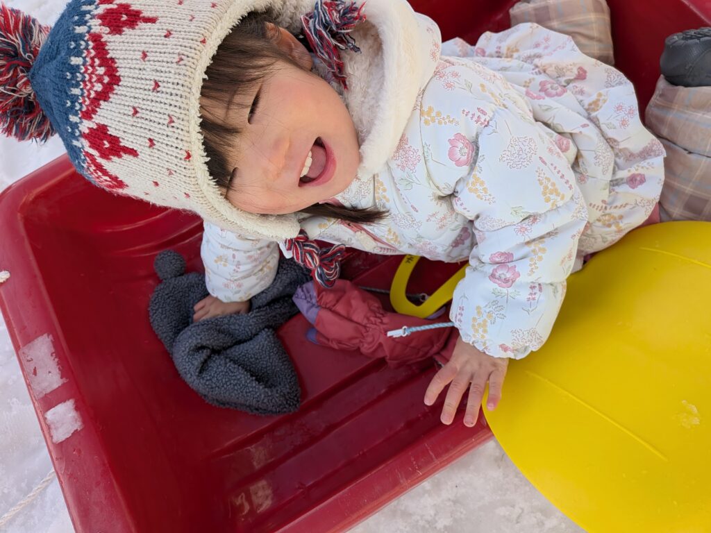 そりで遊んだり、雪山に登ったり、やわらかくなった雪の上をゴロゴロころがったり…