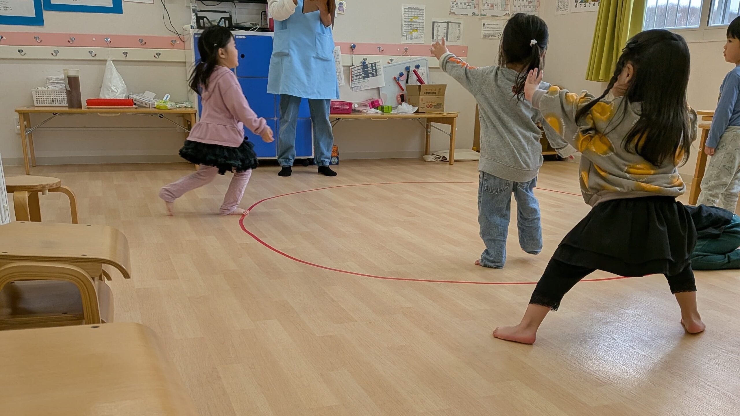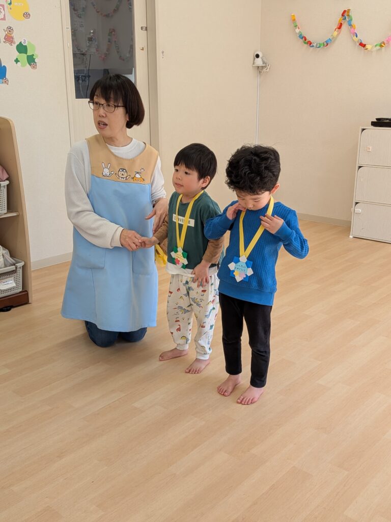 室内では、身体を使って、大きいクラスさんは朝ダッシュ、小さいクラスさんはシャトルランを楽しんで続けています。