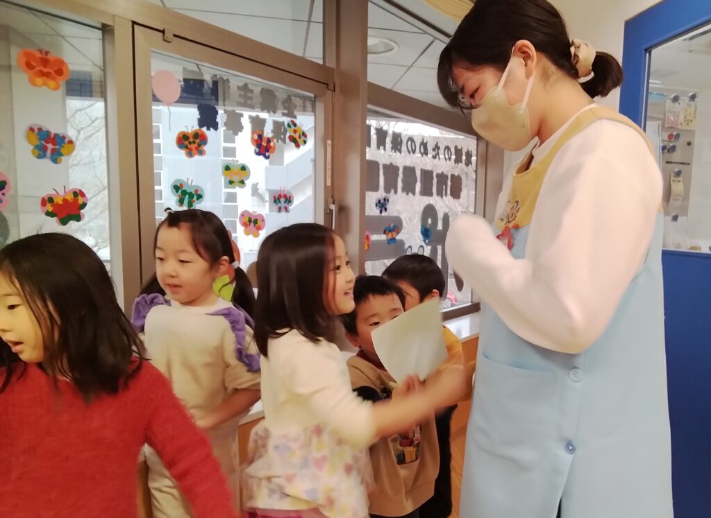子どもたちは、自分たちの持っている折り紙と、先生と同じエプロンの色をみつ