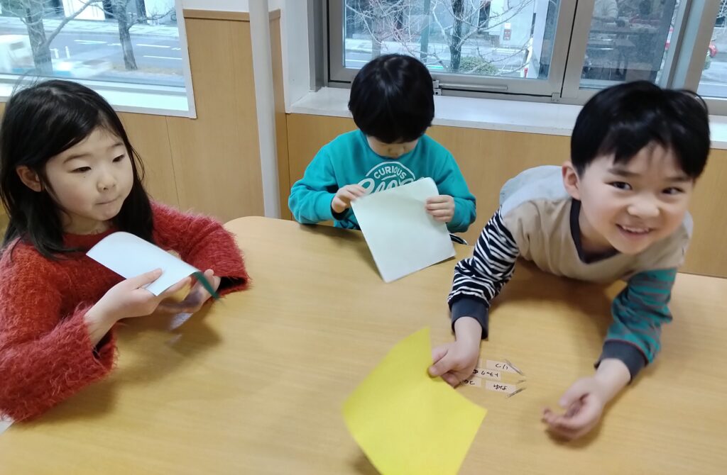 単純な遊びですが、自分たちが決めた好きな折り紙の色を