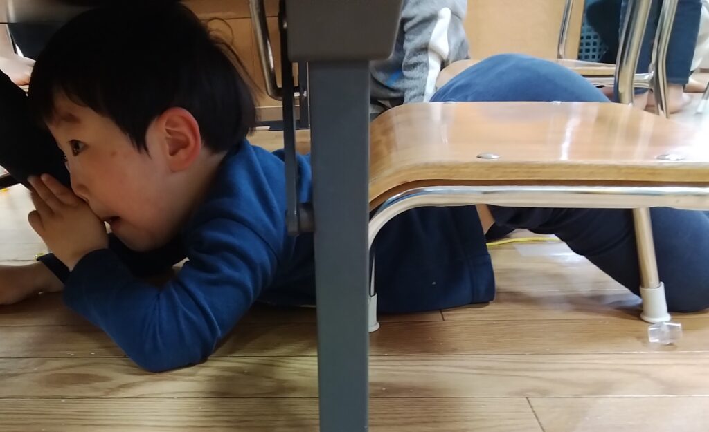 こちらのプラスチックを片付けるとき、こちらの園児さんが、テーブルの下まで