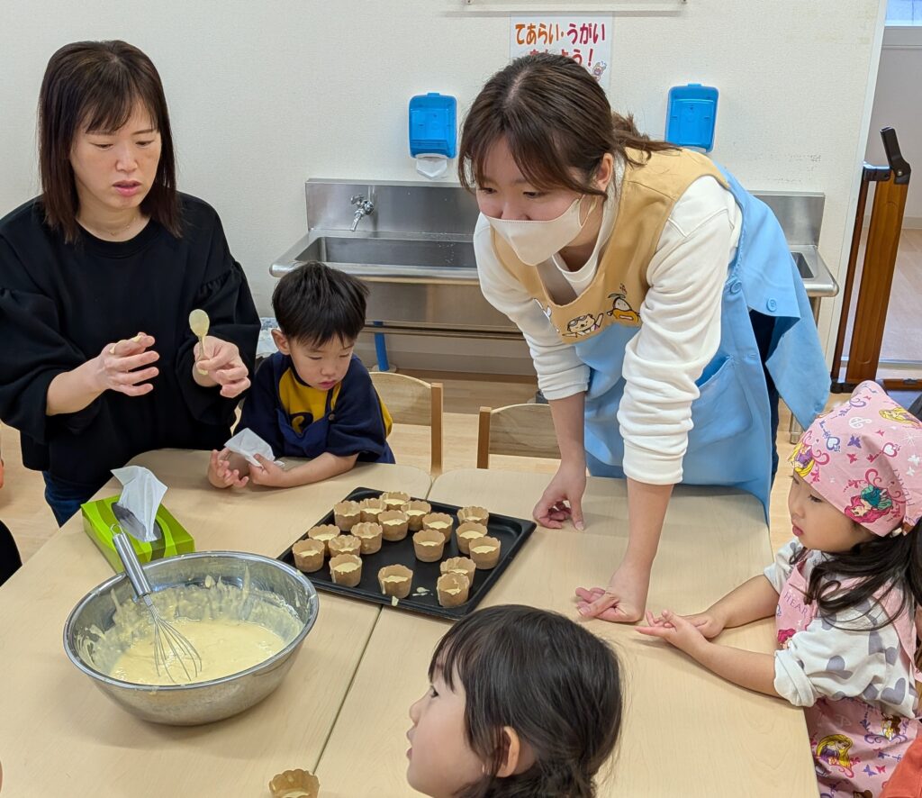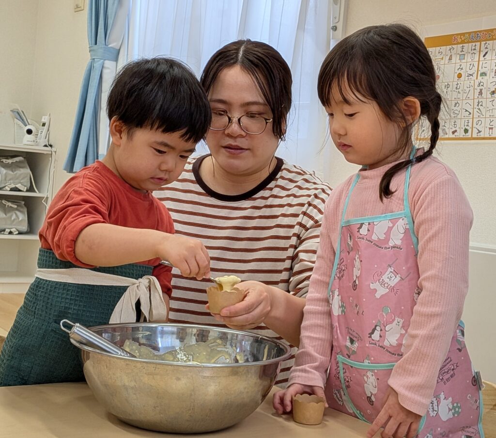 2歳児さんは牛乳を計ったり、卵を割って生地を混ぜ混ぜ…☆