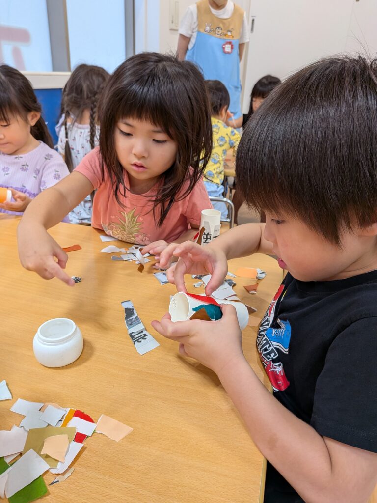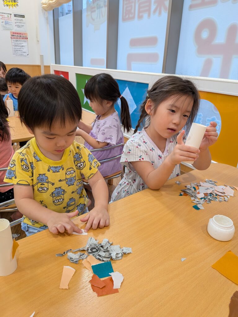 折り紙や新聞紙をびりびりとしている様子…