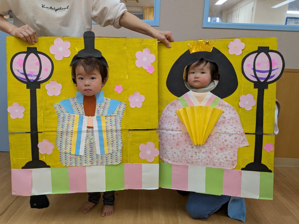 顔はめパネルでお内裏様とお雛様になりきり。みんな嬉しそうでしたよ。