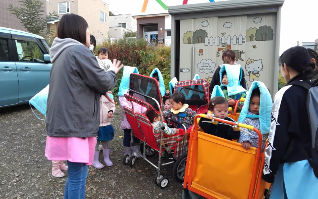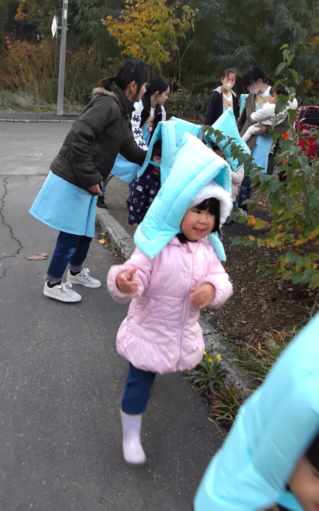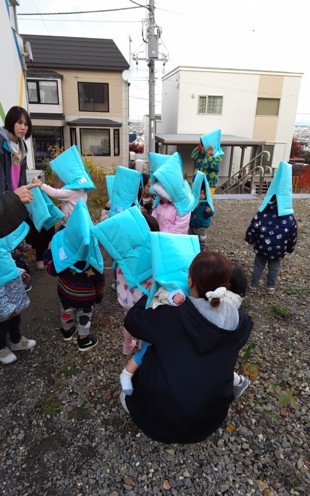 小さい子たちは、防災頭巾を嫌がる子もいたので