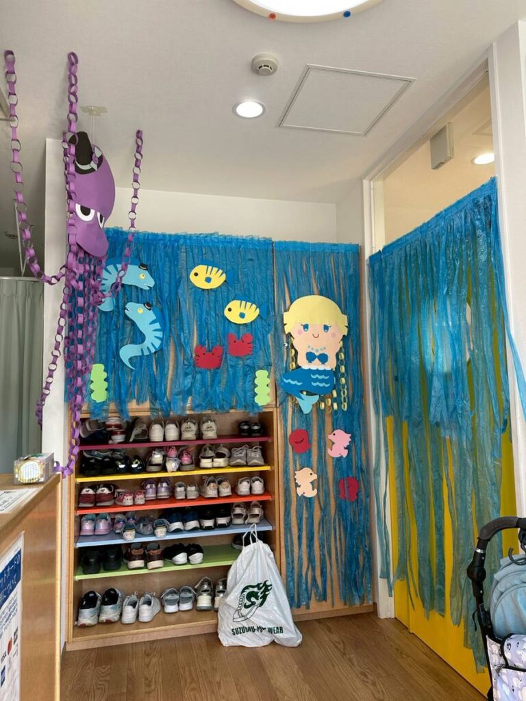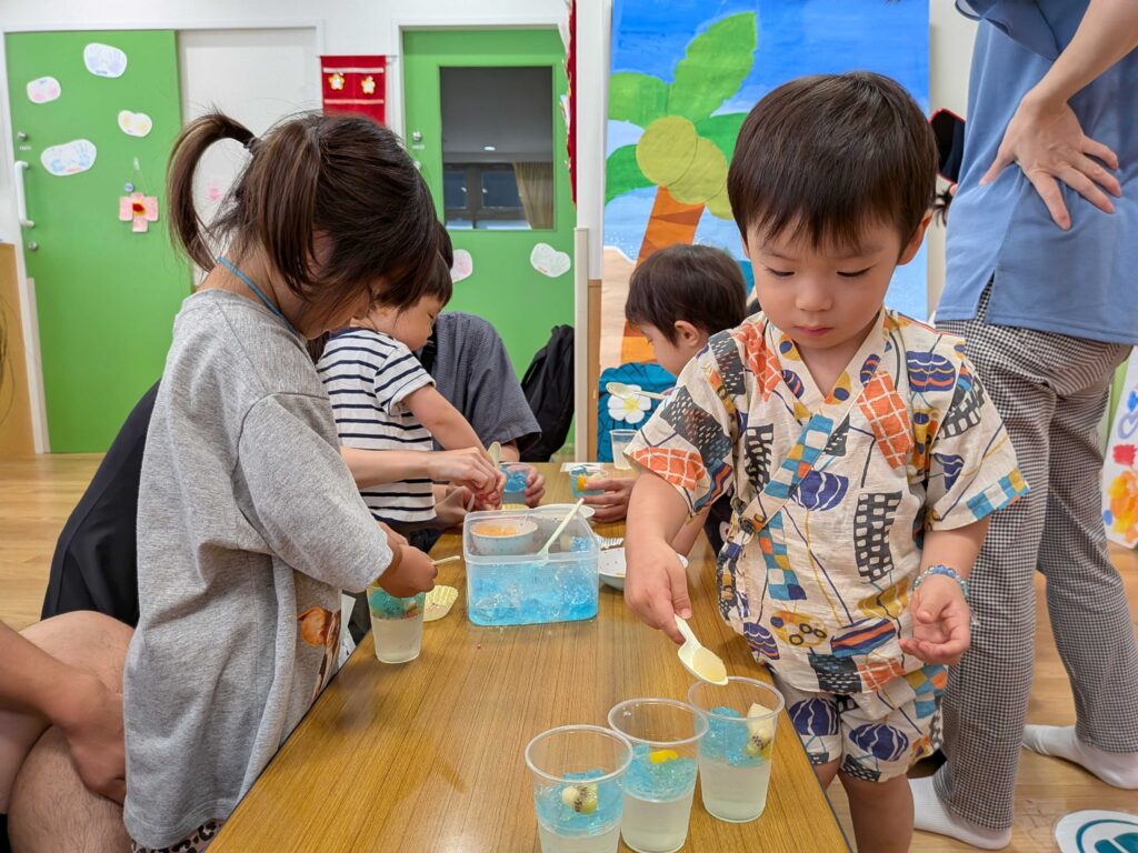 自分のカップに、海色のゼリーと魚型のゼリーとフルーツを入れてみんなでいただきますをしました!