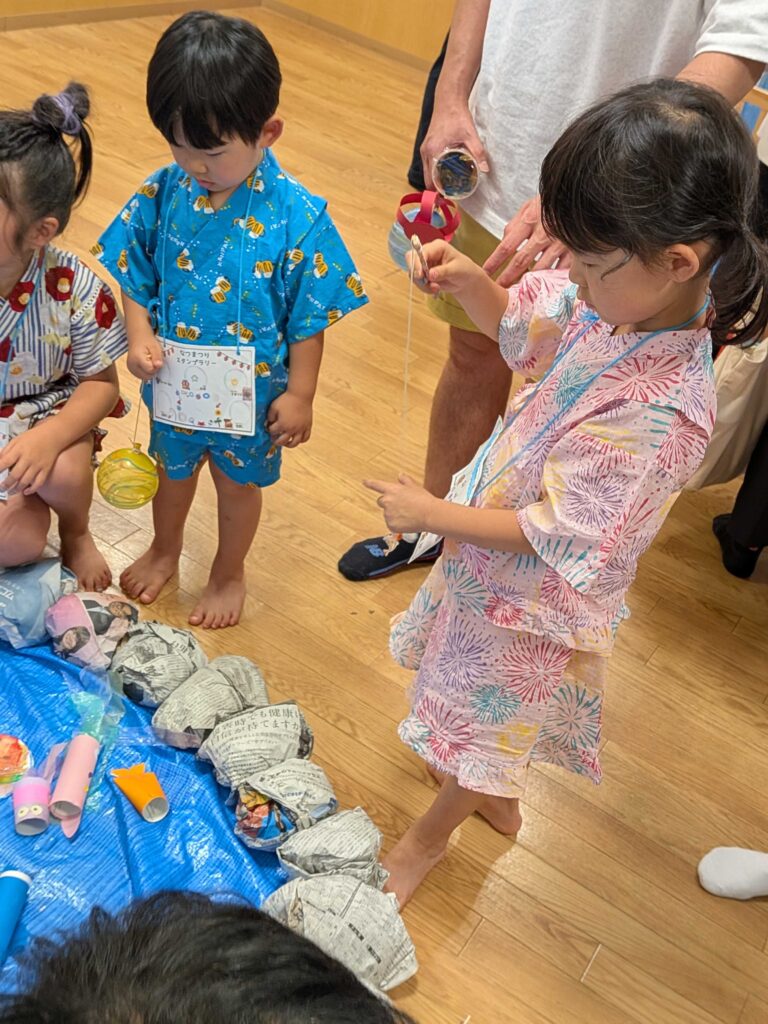 屋台めぐりでは、りんごあめ屋さん、わたあめ屋さん、ジュース屋さん、千本引き、ヨーヨー釣り、魚釣り、宝探しコーナーがありました!