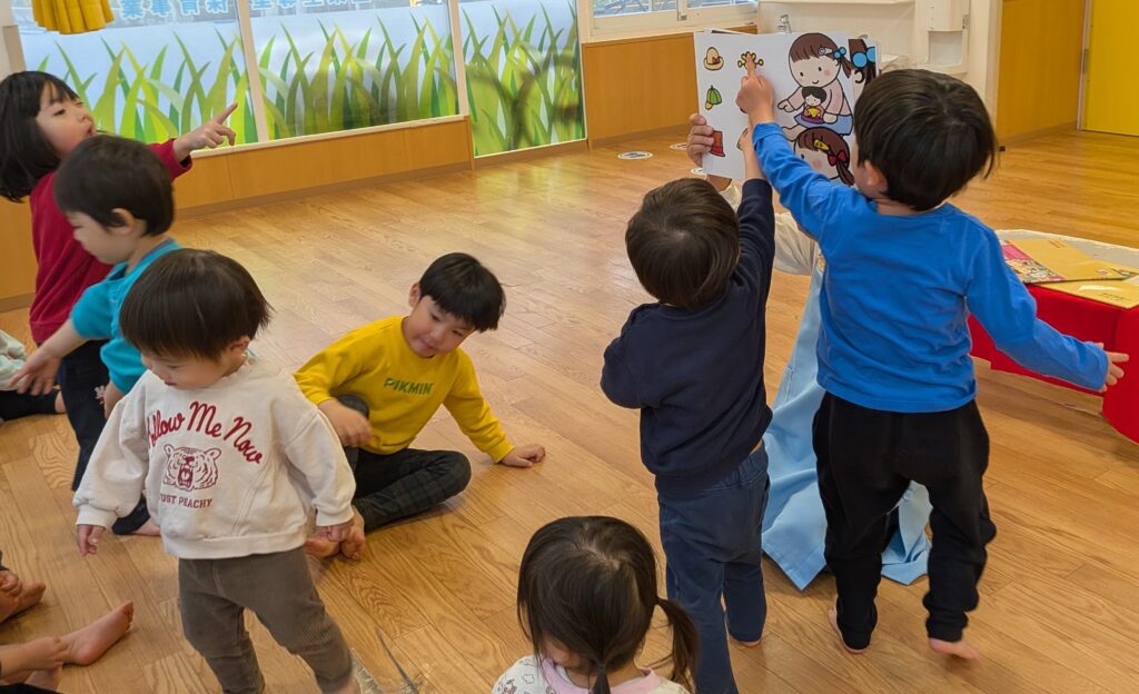 ルームに張り付けられた紙の雛人形を囲んで、「これなあに?」と観察会をしました。キラキラの扇や色鮮やかなお花を見つけ、子どもたちは興味津々な様子で伝統的な飾りに触れていました。