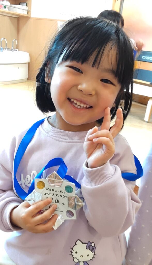 そして、いよいよカルタ大会が始まりました。勝つ子、負ける子と結果はさまざまでしたが、どの子も最後まで一生懸命取り組んでいました。緑バッチのお友達の中には、悔し涙を流す姿も見られましたが、「次は勝ちたい!」と気持ちを切り替え、青バッチさんの勝負を静かに見つめる姿がありました。その姿はとてもかっこよく、成長を感じるひとときでした🌱