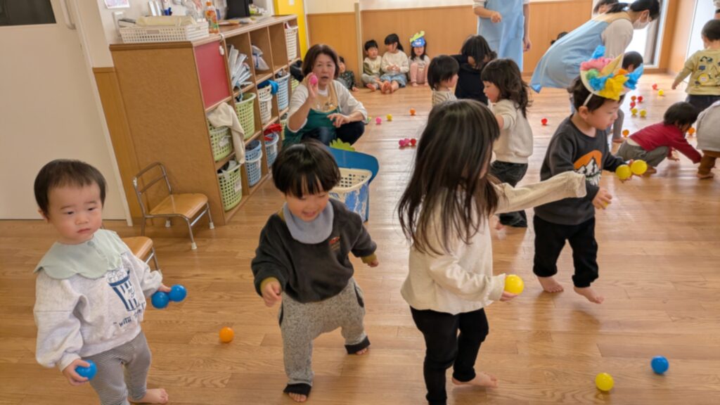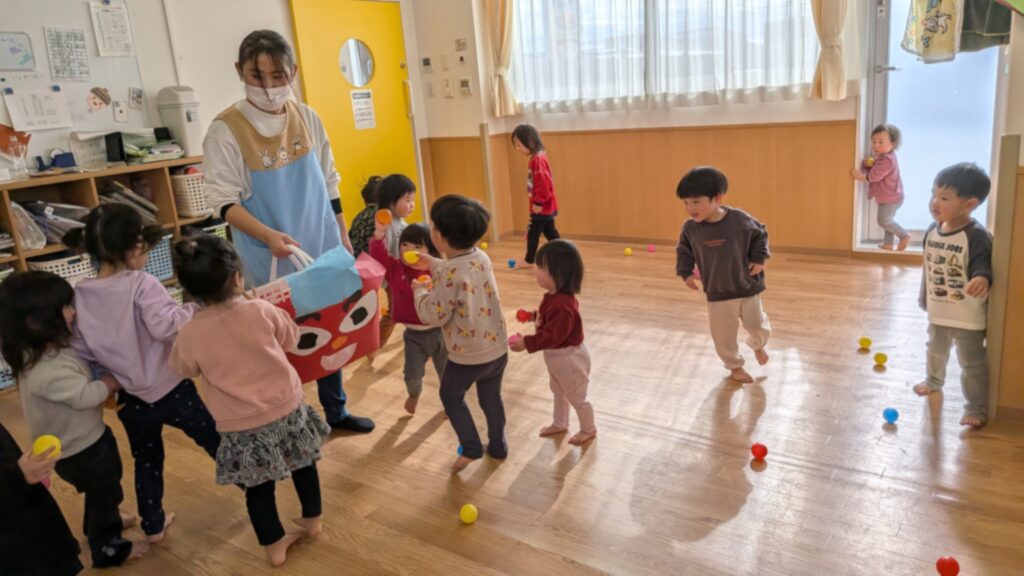 当日は、カラーボールの“まめ”を使って豆まきをしました。