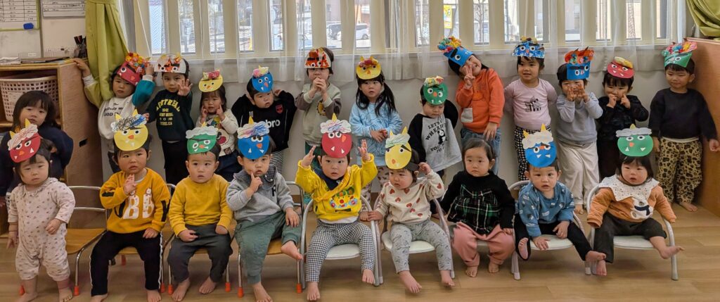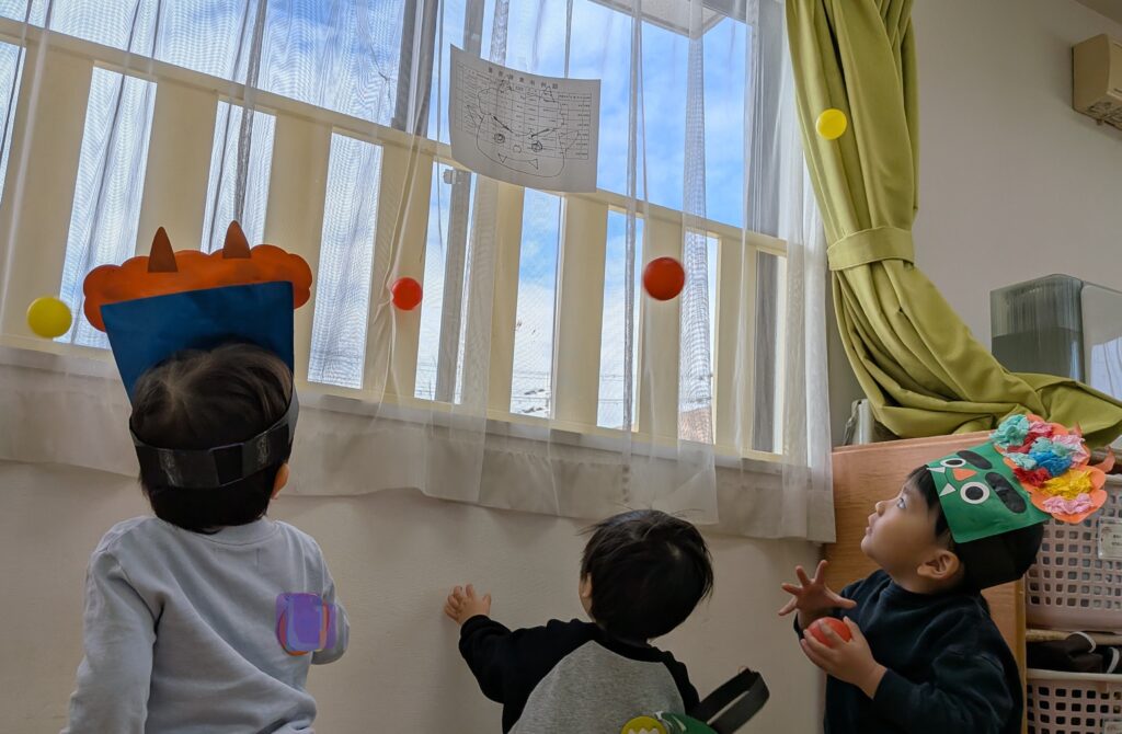 「おにはそと~~🎵ふくはうち~~🎶」子どもたちが大好きな『まめまき』の歌です。今日も、朝の会で元気いっぱいに皆で歌いました🎵