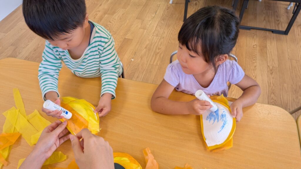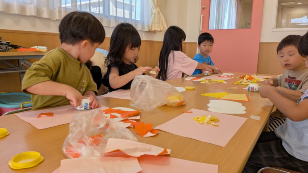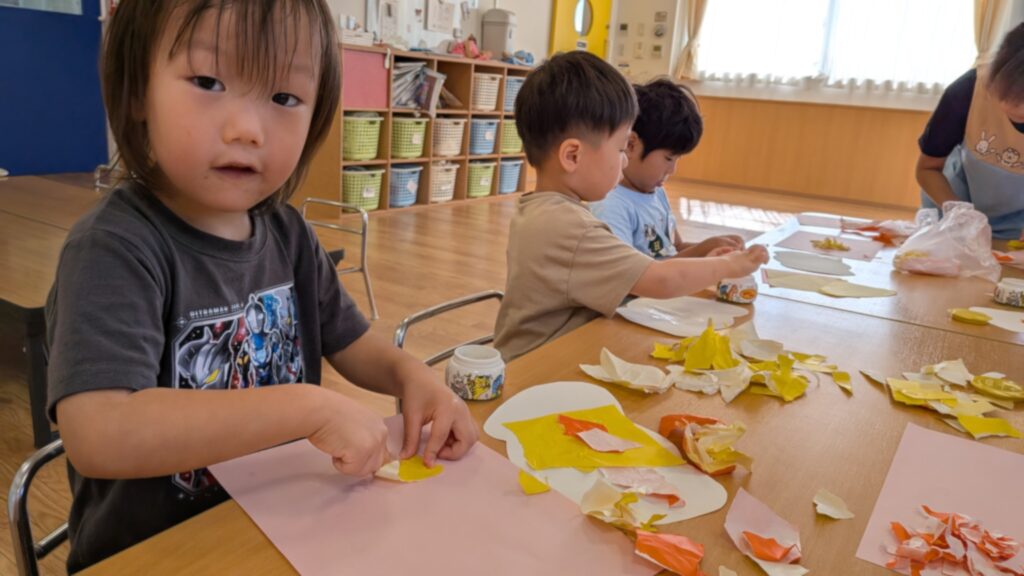 画用紙にオレンジや黄色の折り紙をちぎって貼りました。「これママに見せるの〜」「折り紙もっとちぎるの!」と制作を通して、子どもたちが自分のイメージを形にする楽しさを味わっている様子が伝わってきました。完成した作品を友達同士で見せ合ったり、工夫を褒め合ったりする姿もとても微笑ましかったです。