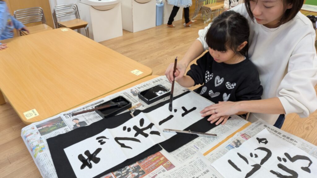 書初めでは、先生と筆をしっかり握り、真剣な表情で取り組む子どもたちの姿がとても印象的でした。「ゆっくり書くんだよ」「はみ出しても大丈夫」と声をかけながら、一人ひとりが思い思いに文字や線を書き、世界に一つだけの素敵な作品が完成しました。