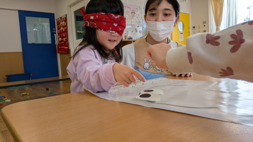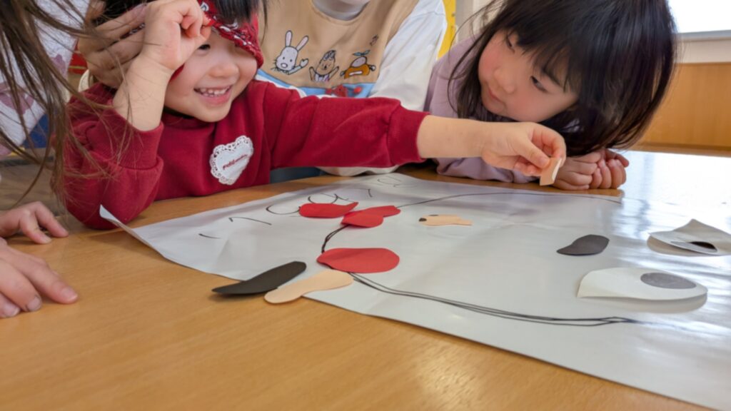 福笑いでは、「目はここかな?」「口がちがうよ〜!」と、子どもたちの笑い声がたくさん聞こえてきました。目隠しをして顔のパーツを置くたびに、周りのお友だちも大盛り上がり。完成した顔を見ては、みんなで大笑いし、日本の伝統的なお正月遊びを楽しむことができました。